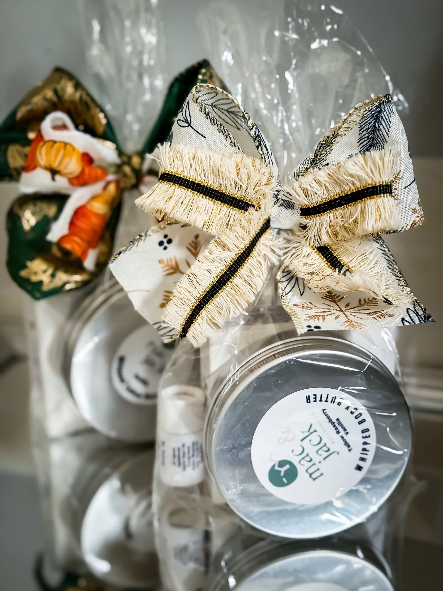 Ready to gift featuring a reusable, handmade holiday bow
